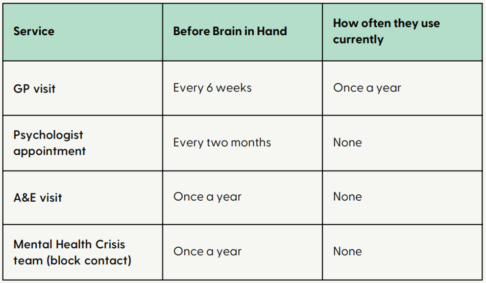 Table 1: Service use before Brain in Hand and since using Brain in Hand