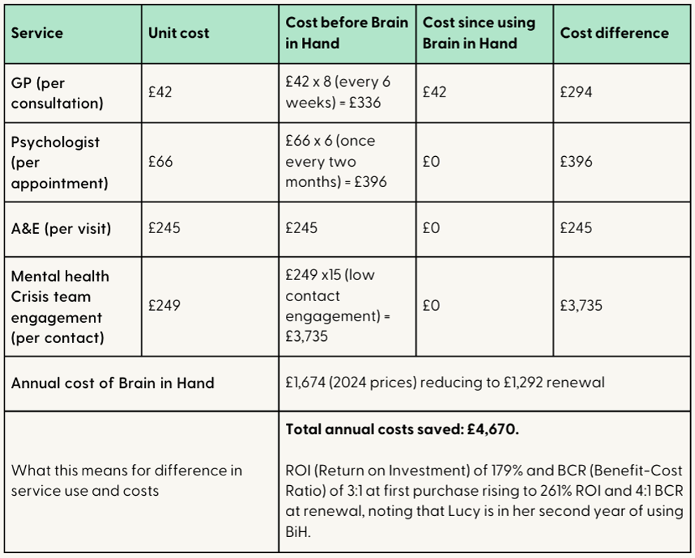Considering Lucy's previous reliance on A&E and the mental health crisis team, and her own belief that she would be using these services again without Brain in Hand, it's reasonable to assume that Brain in Hand has prevented at least one A&E visit and a minimum of 15 contacts with the mental health crisis team over the past year.