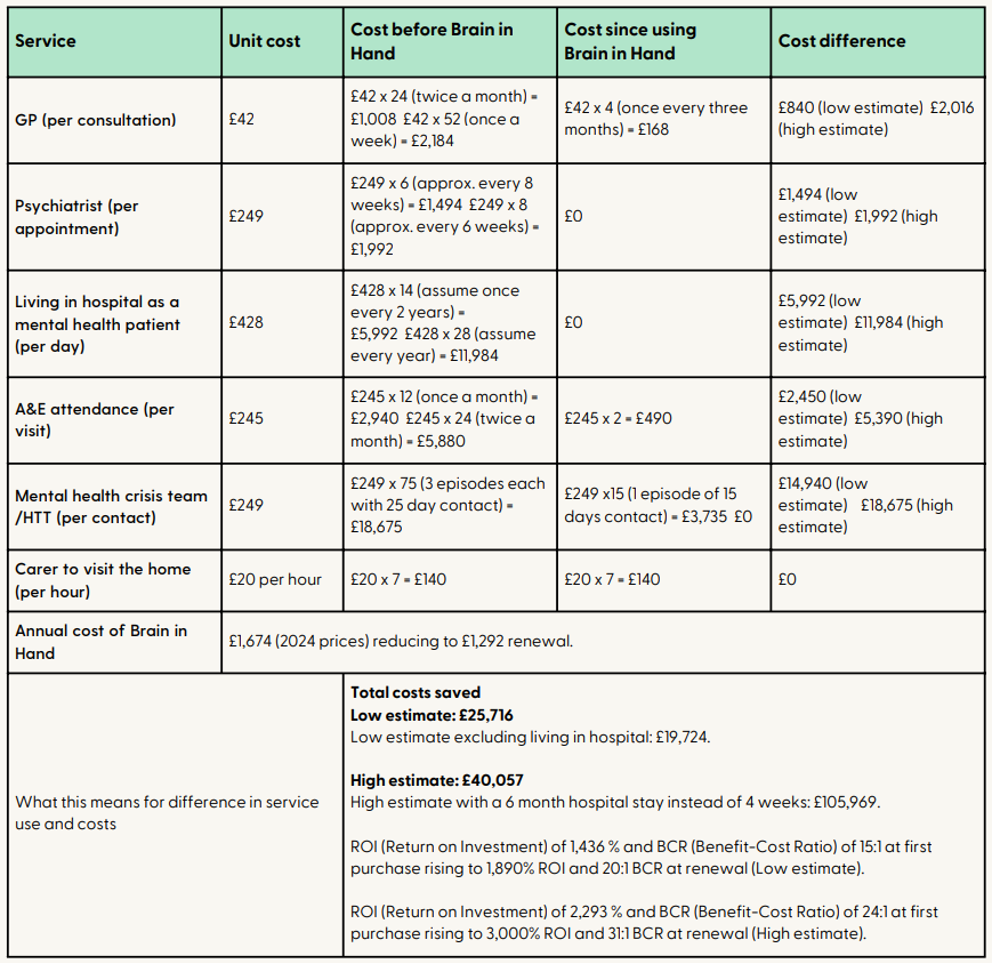 Based on these costs, at the more conservative estimate of the lowest frequency of visits or reduction prior to Brain in Hand there is a predicted annual cost saving of £25,716, with 19% of these costs being attributed to reductions in GP, A&E and psychiatrist, 23% to savings from living in hospital as a mental health patient and 58% to reductions in contacts with the mental health crisis team.