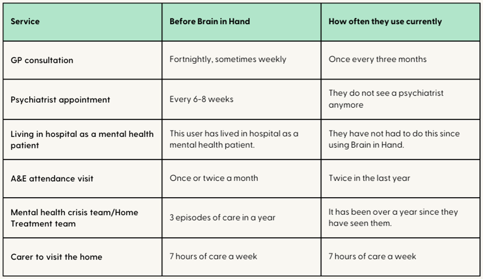 Many of the services Lola accessed in the past have now decreased in frequency using Brain in Hand (see Table 1).