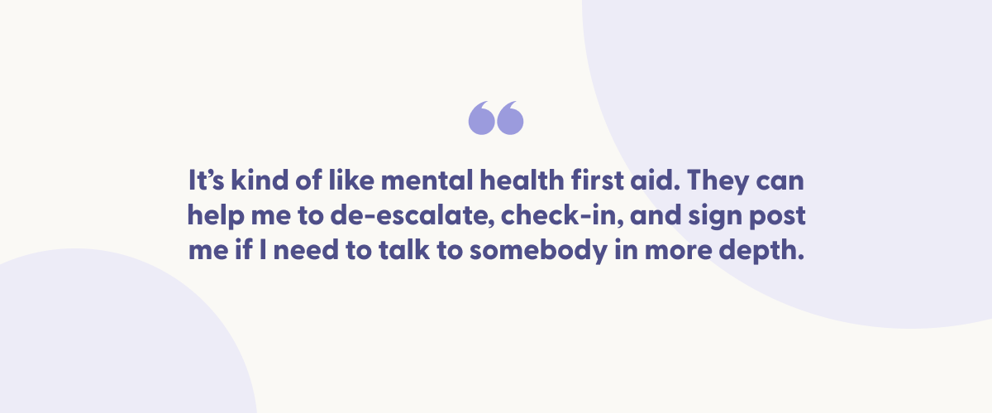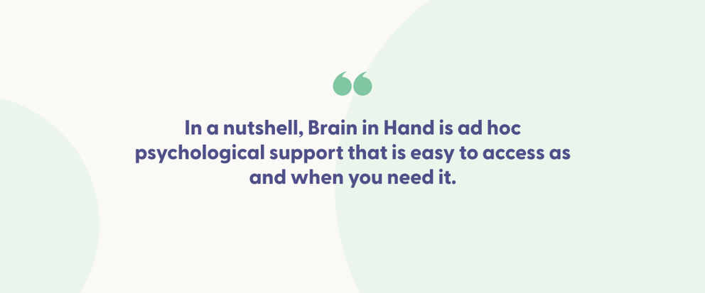 - On-demand human support: “I've made use of the service where you're struggling and you need to speak to somebody to help you through.” she shares how she uses Brain in Hand’s on-demand human support, which is available 24/7. “It’s kind of like mental health first aid, so they can’t fix all my psychological problems, but they can help me to de-escalate, check-in, sign post me if I need to talk to somebody in more depth, that kind of thing. So, this is something I’ve needed for a long time, I just didn’t know it was available until now.”